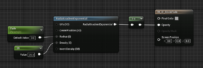 - Add a Radial Gradient Exponential node and two Float nodes. Convert the first float into a parameter and name it something like “Fade,” then plug it into the Radius pin of the RadialGradientExponential node.