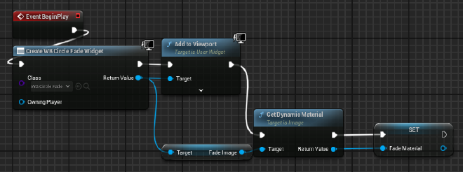 - From the Create Widget node, get the FadeImage from the return value and add the Get Dynamic Material node. Promote the material to a variable, calling it something like “FadeMaterial.”