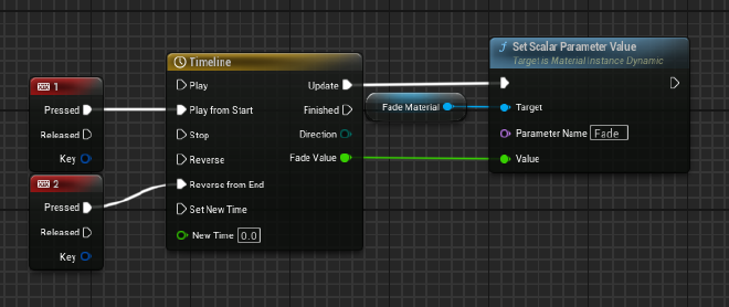 - For testing, I used a keyboard press event to trigger the fade. You can connect it to the Play from Start on the timeline to test the transition. I also added another keyboard press event trigger to test it playing reversed. And that’s it!